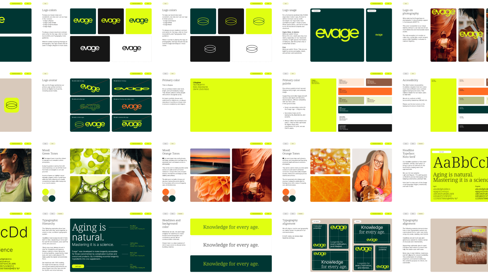 The result is a cohesive brand identity that reframes longevity as an ongoing process rather than a quick fix. evage establishes a strong visual foundation for a scalable platform enabling consistent communication across products, education, digital experiences, and future community-driven initiatives.